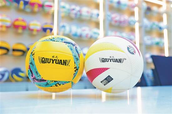 球元运动生产的无缝贴皮排球(右)广受市场青睐