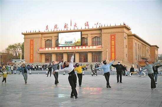 傍晚时分,很多居民在东风航天城的广场上跳广场舞