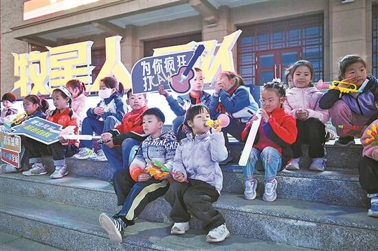 东风航天城礼堂前,小朋友为“牧星人”乐队表演加油助威