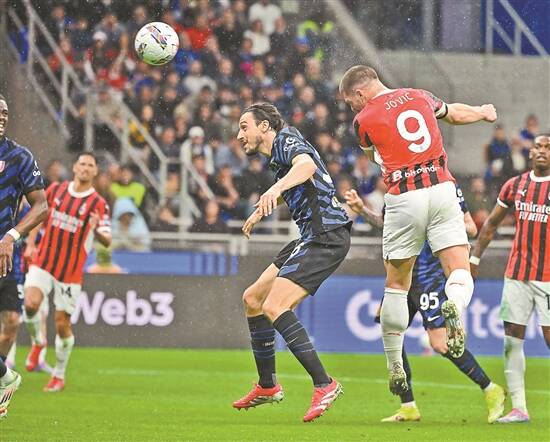 AC米兰队球员约维奇(前右)在比赛中头球攻门得分 新华社发