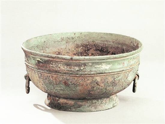 江苏仪征市博物馆藏底部有楼船图像的汉代铜簋。(资料图片)