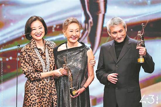 林青霞(左)为施南生(中)、徐克颁发终身成就奖