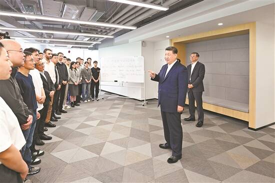 “模速空间”是上海市打造的人工智能大模型专业孵化和加速平台,已入驻企业100余家。习近平来到这里,通过视频短片了解上海市人工智能产业发展情况,察看重点孵化企业的大模型产品展示,听取相关技术研发和企业生产经营介绍。习近平对上海积极发展人工智能取得的实效给予肯定。他指出,人工智能技术加速迭代,正迎来爆发式发展,上海要总结好以大模型产业生态体系孵化人工智能产业等成功经验,加大探索力度,力争在人工智能发展和治理各方面走在前列,产生示范效应。
