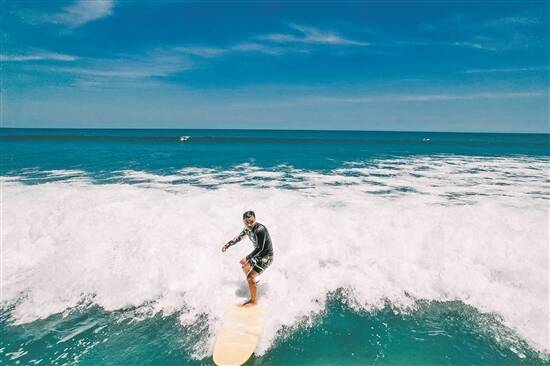 冲浪爱好者在惠州海边踏浪前行