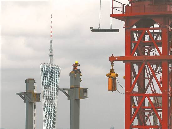 建筑工人与远处的广州塔
