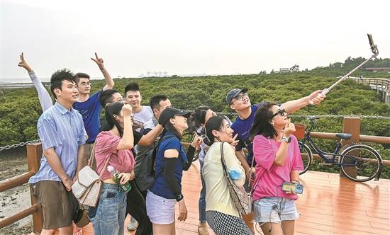 游客们在特呈岛红树林景观栈道上合影 张锋锋 摄