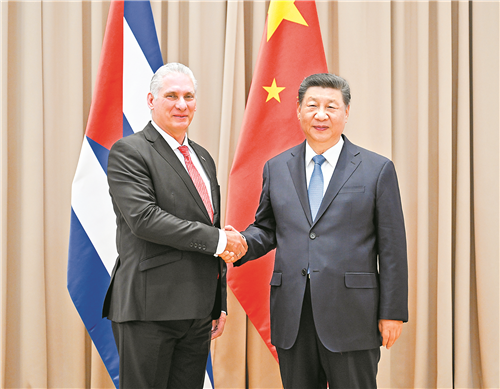 习近平指出,近年来,我同主席同志多次会晤,共同引领中古关系进入政治互信更深厚、战略协作更紧密、民意基础更牢固的新阶段。今年是中古建交65周年,中方愿同古方进一步巩固铁杆情谊,构建更加紧密的中古命运共同体,树立社会主义国家团结合作、发展中国家真诚互助的典范。双方要促进各层级交往、各领域合作进一步走深走实,让高水平政治互信始终成为中古两党两国关系的鲜明标识。中方坚定支持古巴捍卫国家主权、反对外来干涉和封锁,支持古巴经济社会发展。作为全球南方重要成员,双方要在金砖、中拉论坛等框架内加强协调和配合,反对强权政治和单边霸凌,维护国际公平正义。