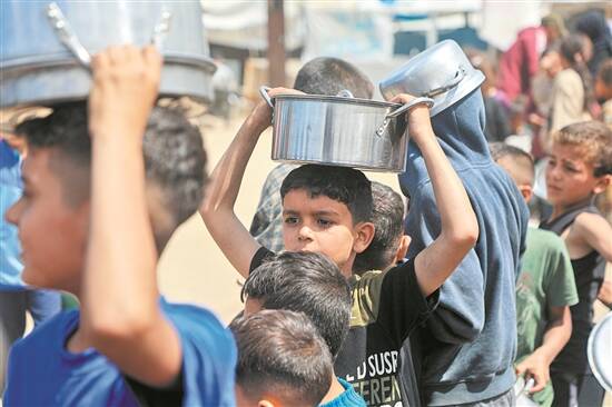 5月2日,孩子们在加沙城等待领取救助食物 新华社发