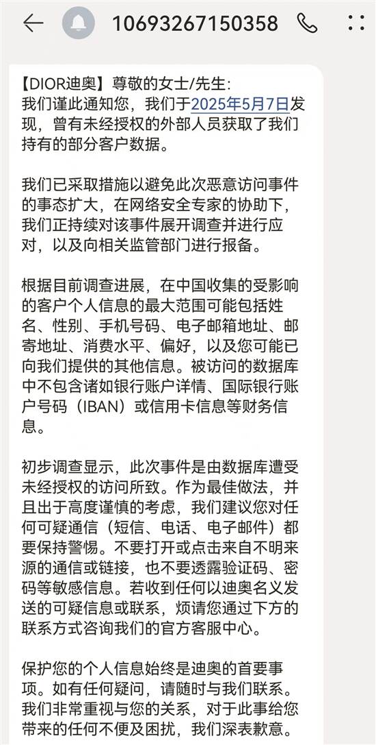 短信中称,初步调查显示,此次事件是由数据库遭受未经授权的访问所致。迪奥建议客户对任何可疑通信(短信、电话、电子邮件)都要保持警惕,不要打开或点击不明来源的通信或链接,也不要透露验证码、密码等敏感信息。若收到任何以迪奥名义发送的可疑信息或联系,请客户咨询迪奥官方客服中心。