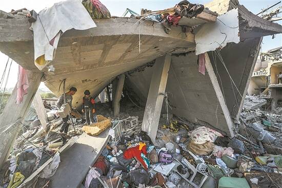 5月14日,在加沙地带北部杰巴利耶地区,巴勒斯坦人查看被以军轰炸后的废墟 新华社发