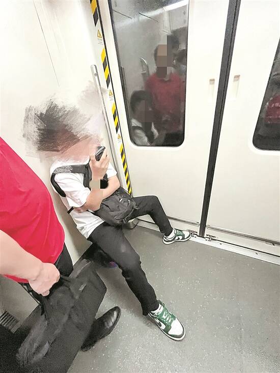 8时,记者从21号线神舟路上车时,差点被一位坐在门边的“板凳族”绊倒。记者观察到,前方没人时,该乘客会将腿向前直伸,约占据两三位乘客站立空间。到站开门时,他虽会收腿,但幅度有限,仍占据空间,对上下车乘客形成视觉盲区。