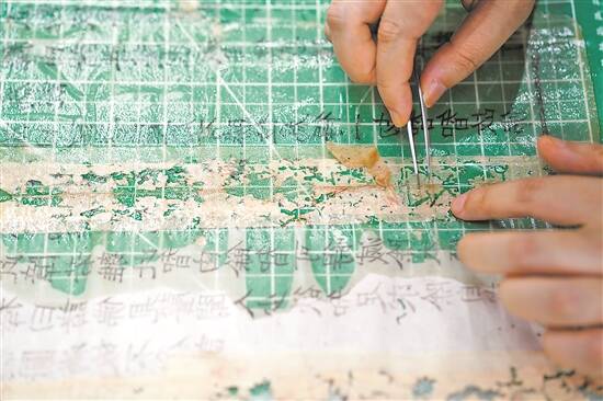 “这次修复《大藏经》的难度,不是一般的大。这些经书的破损程度,应该是我见过最严重的,特别有几册已经破得不成样子了。”国家图书馆研究馆员、国家级非物质文化遗产项目古籍修复技艺代表性传承人杜伟生介绍,“该套经书在民国时期曾用浆糊修复过,书页垫着其他较厚纸张,对经书整体造成了一定破坏。所以,我们这次修复需要先将旧纸张一点点揭开,过程十分繁琐。”