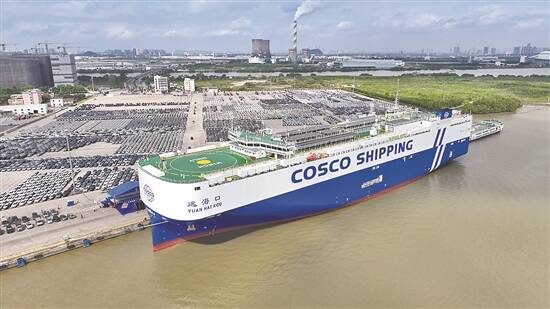 5月15日,中国最大光伏能源+LNG(液化天然气)双燃料汽车运输船“远海口”轮在广州南沙港海嘉汽车码头命名并交付首航,搭载约4000台国产品牌汽车驶向欧洲。