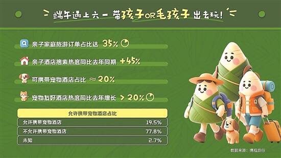 今年端午恰好“撞期”儿童节,极大激发了亲子家庭的出游热情,携程平台上,亲子家庭旅游订单占比达35%,亲子酒店搜索热度同比去年同期上升45%。与此同时,不少年轻人选择带“毛孩子”出游,端午期间宠物友好酒店热度同比去年增长超过20%。值得注意的是,这类酒店的平均房价较普通就当溢价近30%,折射出情感附加值对旅游消费的撬动。