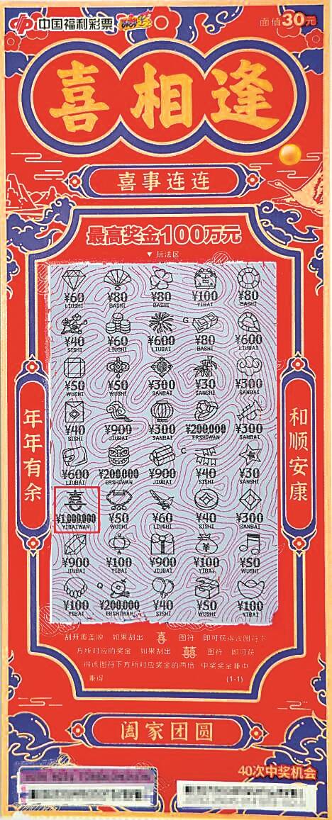 彩民王先生(化名)则是近期在佛山市44130622福彩销售站点购买了2张“喜相逢”刮刮乐(面值50元),刮出一等奖100万元的。王先生表示,自己是一名资深购彩者,购彩就当随手公益。