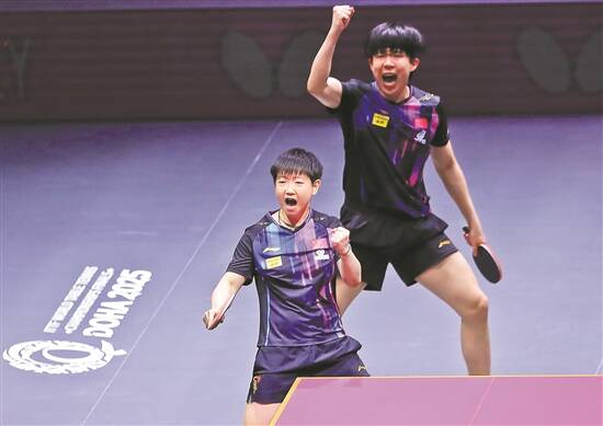 5月24日,王楚钦/孙颖莎(左)在比赛中庆祝得分
