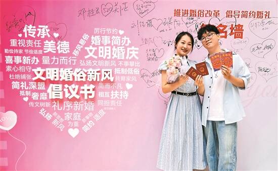 在中山市婚姻登记中心3楼的活动现场,一面粉红色的文明婚俗新风倡议书签名墙格外引人注目,这是中山市福彩中心为倡导文明婚俗精心设计的环节。当天,领结婚证的新人们在了解到新婚俗的内容后,纷纷在文明婚俗新风倡议书展示墙上签名,积极响应“简约婚礼、文明婚俗”的倡议。