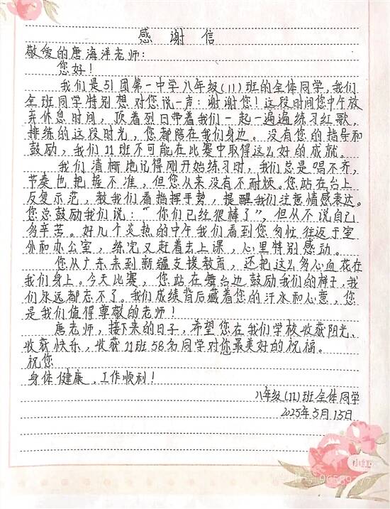 “读到孩子们的感谢信时,我眼眶一下子就湿润了。”唐海洋抚摸着写满签名的册子说道,“我只是做了教师的本职工作,孩子们却给了我深厚情谊,这份感动会永远珍藏在我的教育生涯中。”翻看着比赛合照,他指着自己指挥时的身影感慨:“看到孩子们从跑调到完美演绎的成长,每一个午休加练、每一次汗流浃背的排练,都是最珍贵的回忆。”