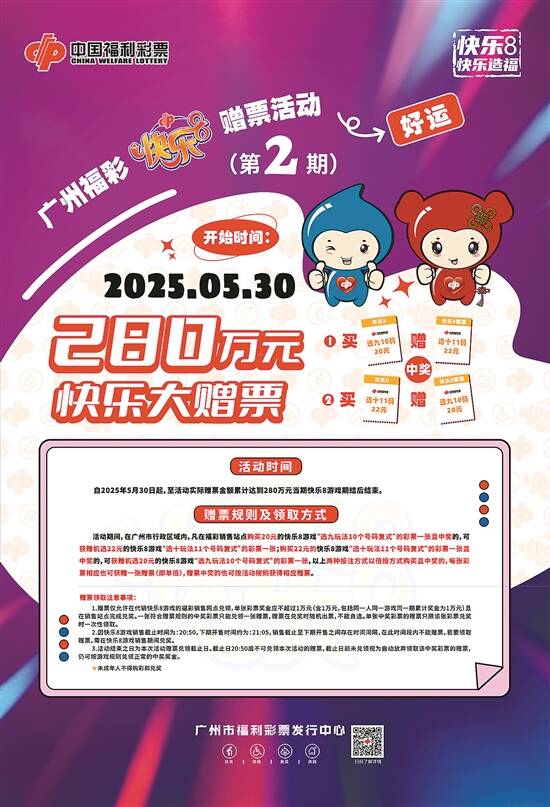 近日,广州市福利彩票发行中心发布公告,自2025年5月30日起,继续在全市范围内开展“快乐8快乐大赠票”促销活动。这也是继4月份730万元赠票活动以来,该中心第二次开展快乐8游戏赠票促销活动,回馈广大购彩者。