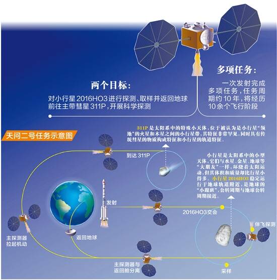 天问二号任务设计周期10年左右,主要任务目标是对小行星2016HO3进行探测、取样并返回地球,此后再对主带彗星311P开展科学探测。这是继探月、探火后,中国人在浩瀚星宇的又一次重要探索之旅。