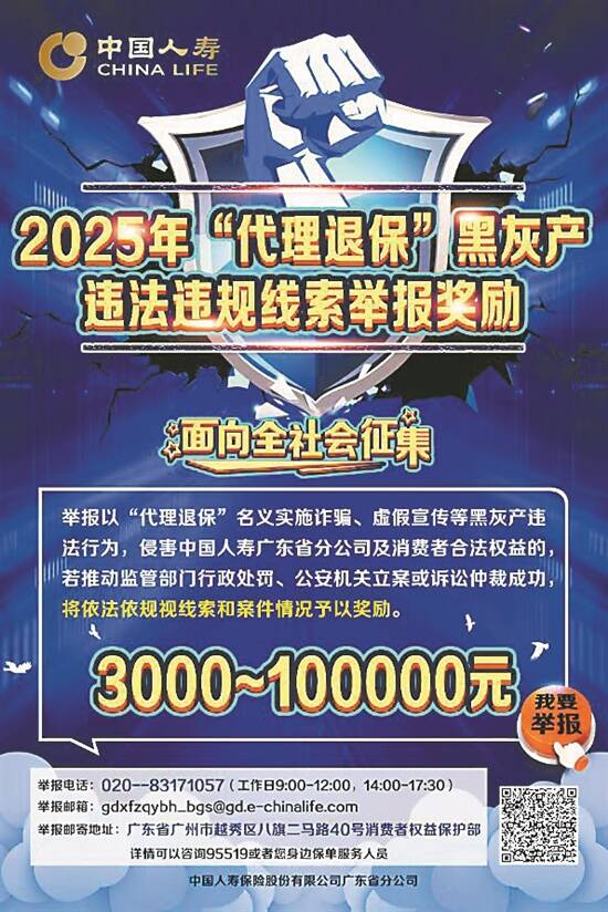 为了凝聚社会各方力量,斩断扰乱金融市场秩序黑色产业链,铲除“代理退保”黑灰产的滋生土壤,广东国寿决定首次向社会公开发起2025年反“代理退保”黑灰产线索公共征集奖励行动,呼吁广大消费者举报以“代理退保”名义实施诈骗、虚假宣传等侵害广东国寿及消费者合法权益的黑灰产线索,若推动监管部门行政处罚、公安机关立案或诉讼仲裁成功,将依法依规视线索和案件情况予以税前奖励。