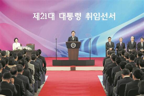 韩国总统李在明当地时间4日上午11时许在国会正式宣誓就职 新华社发