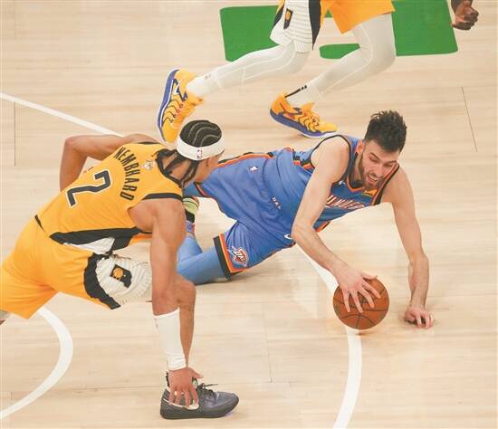 雷霆球员霍姆格伦(右)倒地拼抢 新华社发