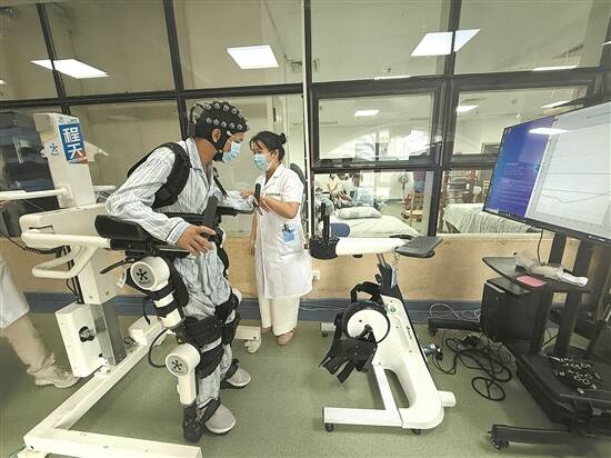 头顶布满电极的金属帽,41岁的脊髓损伤患者陈明(化名)盯着前方屏幕,集中意念抬腿。当脑电波信号被实时解码,机械外骨骼启动,支撑他迈开脚步。“患者通过非侵入式脑机接口,实现大脑与外部设备的双向交互。脑电波信号被解码后,驱动外部设备,带动肢体活动或触发肌肉收缩,从而促进下肢功能的恢复。”南方医科大学珠江医院康复医学科主任吴文向记者解释。