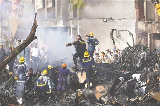 社交媒体上流传的一段事故视频显示,客机低空飞行,未能顺利爬升,随后发生爆炸,空中腾起巨大火球,现场冒出浓浓黑烟。当地电视台播放的画面显示,消防人员正在进行救援,被撞大楼楼体漆黑,外墙玻璃几乎全部被毁。