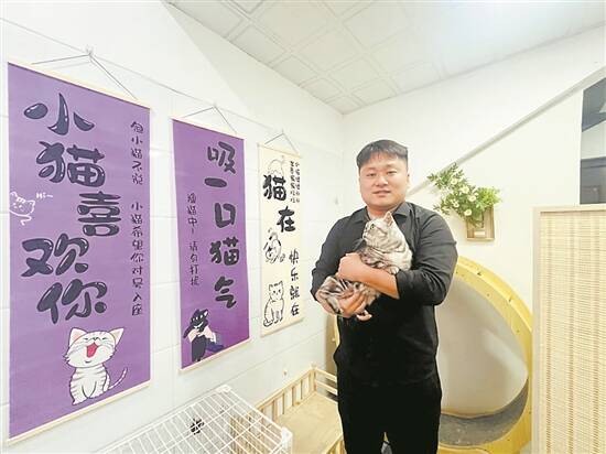 焕新后的空间处处可见巧思:猫咪小脚印、萌宠立牌、照片墙……徐永浩精心挑选了温顺的猫咪品种,还配备专业护理设备。“猫咪都是打过疫苗的,我还准备了撸猫手套,防护措施做得足足的。”