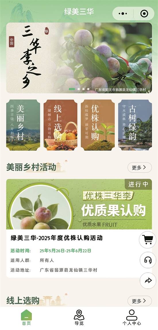 打开“三华村”小程序,用户可轻松参与正在开展的2株百年古树认养和20株三华李优株认购活动。指尖轻点,即可获取三华李优株的透明信息,数字三维追溯果树生长全流程,在线选购“心选”果树,当年所产的20箱优质果将寄送到家门口,享受从枝头到舌尖的鲜美体验。