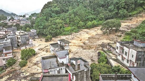 17日,茂名信宜市贵子镇联二村山体滑坡灾害现场,部分房屋被泥水吞噬