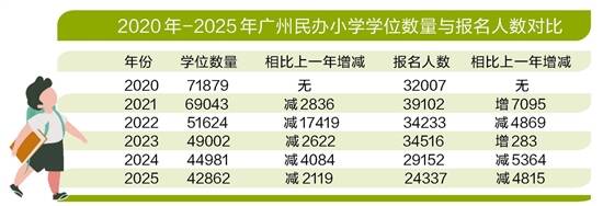 日前,广州11区民办小学电脑摇号派位结束。17日,《隽言教育》从广州市教育局获悉,全市245所民办小学提供42862个学位,报名儿童24337人。相比2024年,报名人数减少4815人,招生学校减少2所,学位数量减少2119个。学位数量和报名人数都创6年来最低。