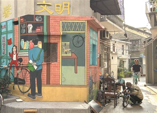 5月26日早上,海珠区滨江街道益丰社区胡巷。一家自行车修理店的墙画抢眼了——画着老式百货店的场景,还有修车档口的门面。画中央那对父女,小女孩坐在自行车的大杠上,小手举着一面国旗,父亲在前面看着她。匆忙的上班路上,因为这一瞥变得温暖起来。