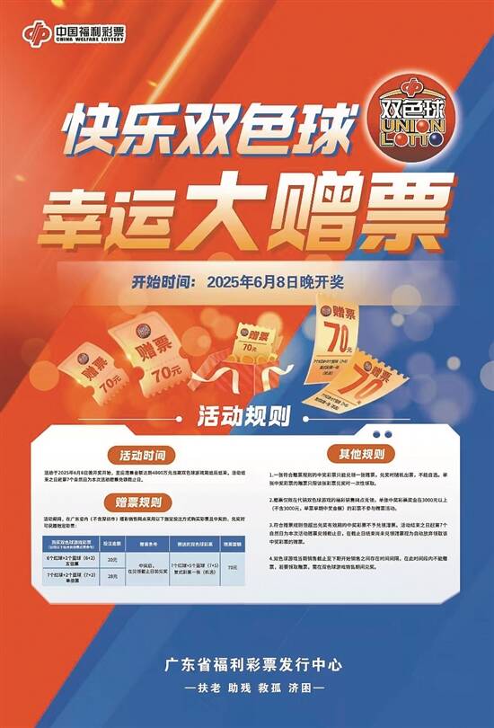 福利彩票不仅是一张张承载着幸运梦想的纸片,更是一份份汇聚爱心、传递温暖的公益力量。广东福彩“快乐双色球 幸运大赠票”4800万元营销活动正在进行中,彩民朋友不妨趁此机会,在收获福彩惊喜的同时,奉献爱心,助力公益。广东福彩温馨提示,理性购彩、量力而行,切勿盲目投注。