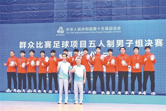 广东队在十五运会群众组足球项目男子五人制甲组颁奖仪式上