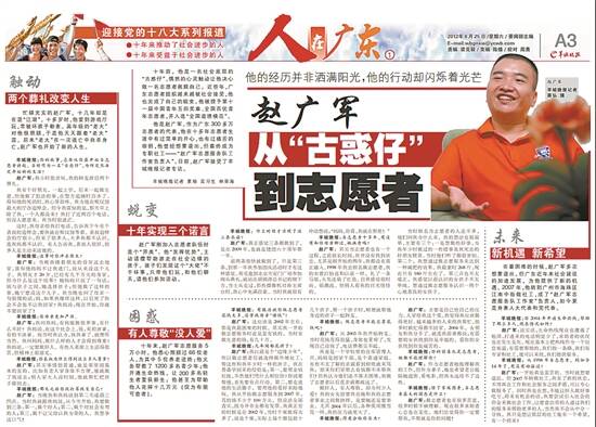 “符记者又问我,现在最想做的是什么。我就说我想帮助那些曾像我一样年少无知的小朋友。”赵广军年轻时,卖过盗版光碟,沉迷网络,泡过酒吧,参与过打架斗殴,直到同为“古惑仔”的好友去世,他才幡然醒悟,加入广州市青年志愿者协会,开始寻找人生的真正意义。