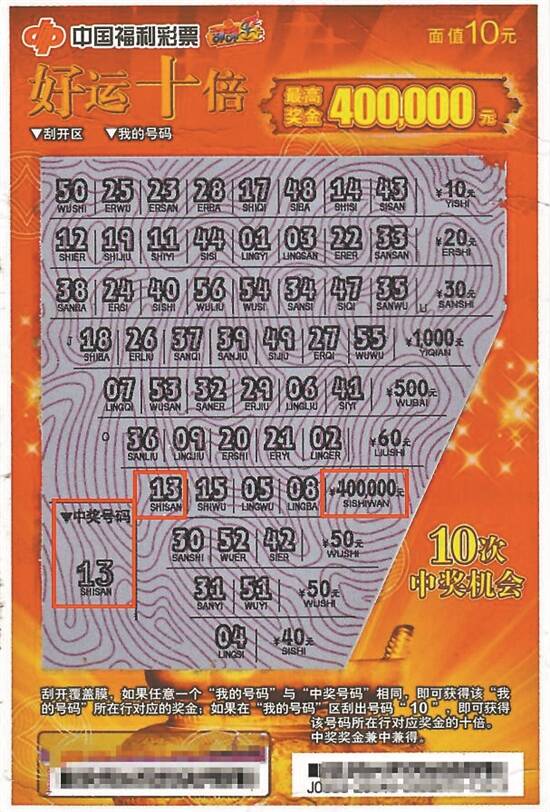 莫先生回想起当时刮彩的情形仍然很激动,当时他刮开彩票看到“中奖号码”和“我的号码”区域都出现了数字“13”,再看对应的中奖奖金。“我第一眼还把中奖奖金误看成4万元,兴奋地跟站点负责人说,自己中了4万元!”