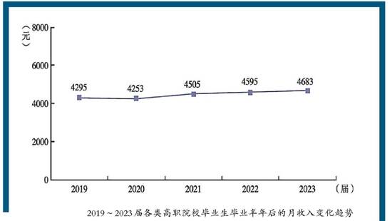 2023届高职毕业生平均月收入达到4683元,超过城镇居民月均可支配收入4318元,与2019届相比实际涨幅为3.2%。