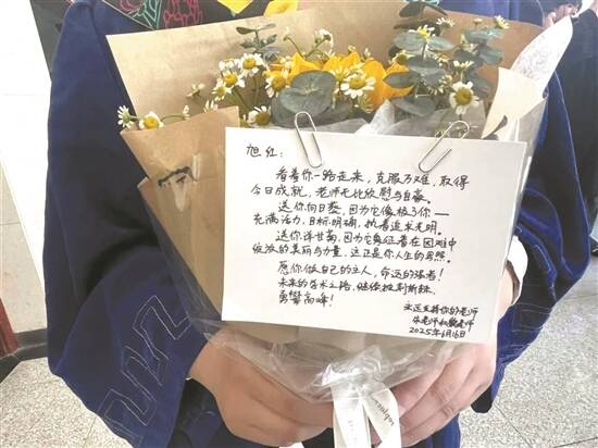 毕业时,导师朱磊和妻子送给赵旭红一束花,附有一张手写明信片:“送你向日葵,因为它像极了你——充满活力,目标明确,执着追求光明。送你洋甘菊,因为它象征着在困难中绽放的美丽与力量,这正是你人生的写照。愿你做自己的主人,命运的强者!”