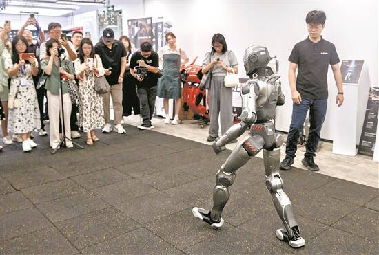 人形机器人PM01在展厅中央大步走
