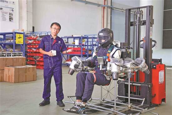 6月25日,广州南沙的广东空天科技研究院讲解员为采访团记者介绍单人喷气飞行背包