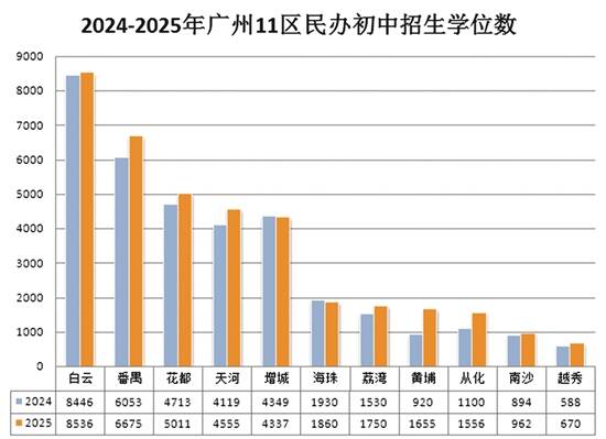 2025年,广州11区民办初中学位数量从高到低排列分别为:白云18所学校,提供8536个学位;番禺31所学校,提供6675个学位;花都19所学校,提供5011个学位;天河25所学校,提供4555个学位;增城25所学校,提供4337个学位;海珠7所学校,提供1860个学位;荔湾12所学校,提供1750个学位;黄埔9所学校,提供1655个学位;从化5所学校,提供1556个学位;南沙5所学校,提供962个学位;越秀4所学校,提供670个学位。