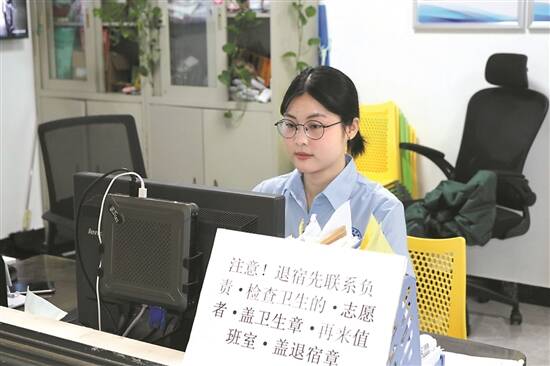 宿管员的工作琐碎而繁杂,每天廖丽丹要按时巡楼、认真查寝。“我们这栋宿舍有将近3000名学生,和他们接触中我也渐渐学会保持良好的心态,心理素质有所提升。”廖丽丹说。
