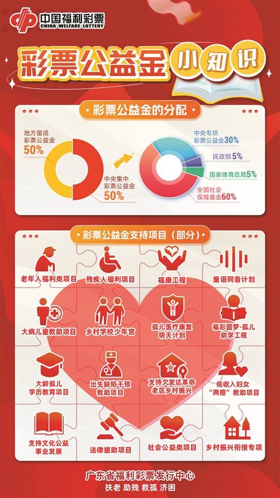 每一张福利彩票,承载着购彩者的爱心,肩负公益使命。中国福利彩票发行销售所募集的福彩公益金全部上缴财政,主要用于补充全国社会保障基金、支持教育助教助学、发展残疾人事业、困难群体大病救助、补助城乡医疗救助基金以及扶贫等社会公益事业;重点用于老年人、残疾人、孤儿、留守儿童、困难群众等社会福利事业。