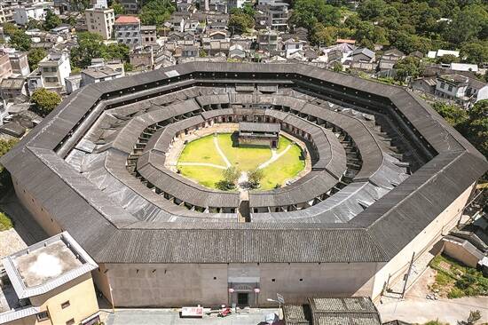 羊城晚报记者跟随他的步伐登上三楼廊道,从高处俯瞰,八个梯形单元围合成一个面积上万平方米的正八边形。楼内每个开间皆被精心设计为三进两天井,前、中进为宽敞平房,后进则是三层高楼,错落间透出这座“中国迄今发现最大的八角形土楼”的古雅大方。