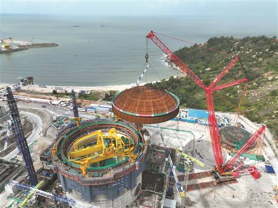 羊城晚报讯 记者程行欢报道:7月14日10时26分,中广核广东陆丰核电6号机组穹顶成功吊装就位,标志着该台“华龙一号”核电机组反应堆厂房成功封顶,工程建设正式由土建施工阶段全面转入设备安装阶段。
