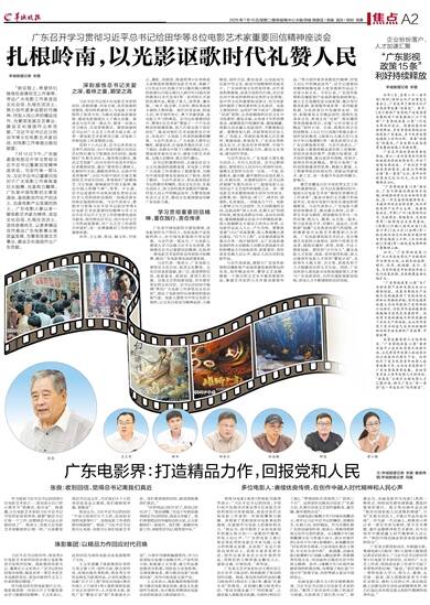 7月14日下午,广东省委宣传部召开学习贯彻习近平总书记重要回信精神座谈会。与会代表一致认为,习近平总书记重要回信对于广大电影工作者既是巨大鼓舞,也是有力鞭策。广东是中国电影的主要发源地,是电影创作生产的沃土,也是电影产业发展的热土。广东电影人要以老一辈电影艺术家为榜样,坚定文化自信,扎根生活沃土,坚持崇德尚艺,以更多精品佳作推动广东电影事业高质量发展,为繁荣发展文艺事业、建设文化强国作出广东贡献。