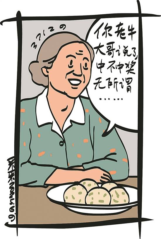 老牛媳妇蒸了一大锅槐花菜团子,还送给邻居们,逢人就说:“我们家老牛自从迷上买彩票就变好啦,你们看看,给我撸回来一大堆槐树花。这下,大家可都有口福了。”有人问老牛媳妇:“那我老牛大哥买彩票中过大奖不?”老牛媳妇说:“你老牛大哥说了,中不中奖无所谓,要有一颗乐观快乐的心,多为社会公益事业出出力。”
