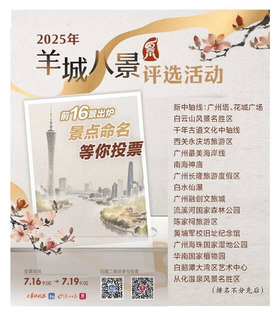 经过网络投票和专家调研评审,2025年“羊城八景”评选活动前16景正式出炉。从7月16日9时起,活动组委会举行为期三天的“羊城八景”名称网络投票活动,邀请广大市民为自己心水的景点(区)名称投票“打Call”。